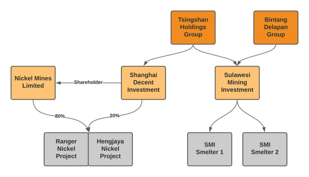 The initial phase of the park’s construction began in 2013 with two NPI plants that went online in 2015 and 2016. Two additional NPI plants, the Ranger Nickel Project and Hengjaya Nickel Project, both of which are two-line RKEF plants, began production in 2019. Today there are 11 smelters inside the IMIP. The Australia-based Nickel Mines Limited owns 80% of these two NPI projects. Shanghai Decent Investment, another wholly owned subsidiary of Tsingshan, is a significant shareholder in Nickel Mines Limited. Another two smelters are owned by PT Sulawesi Mining Investment, which is owned by Tsingshan Group and the Indonesian Bintang Delapan Group.
