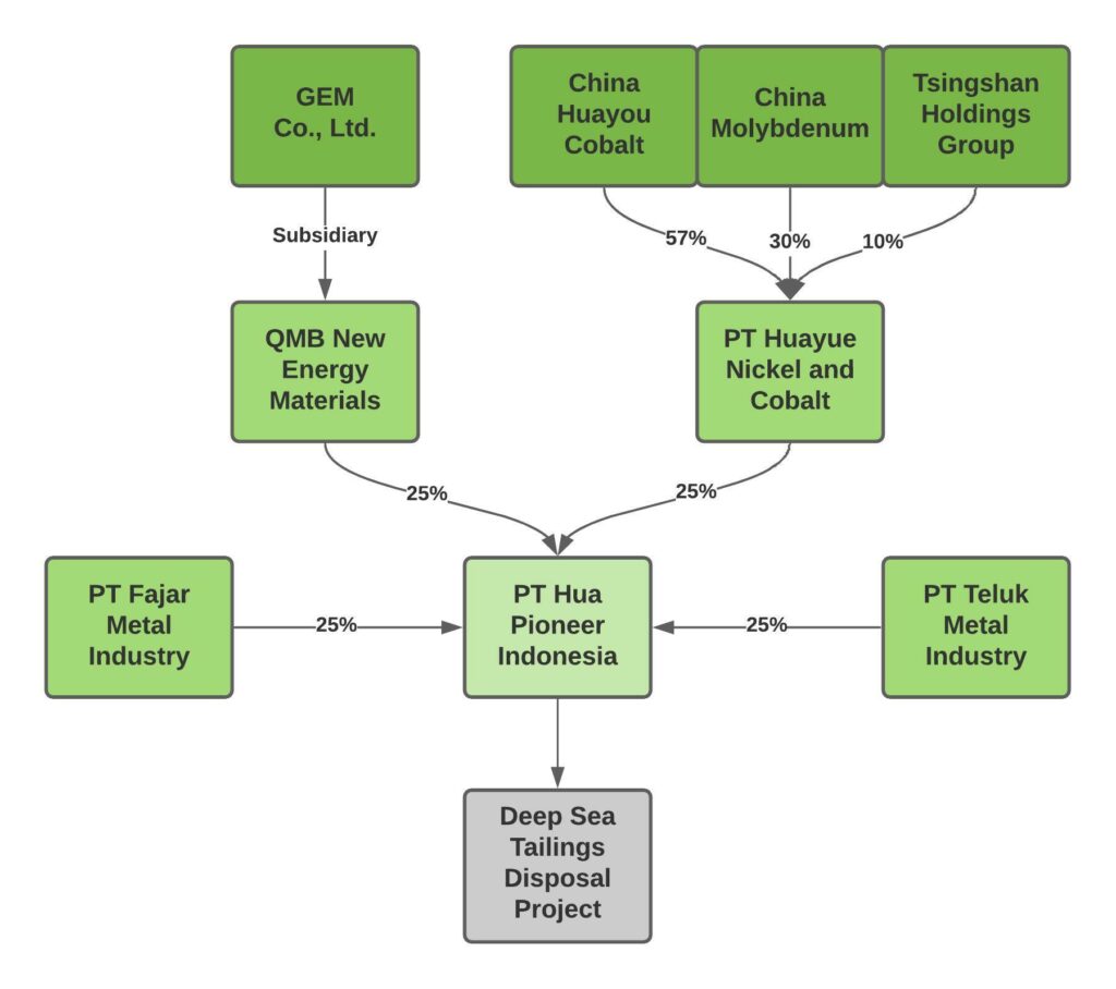 In early 2019, QMB New Energy Materials and PT Huayue Nickel and Cobalt, along with two Indonesian partners, established PT Hua Pioneer Indonesia to develop and apply for permits to carry out deep-sea tailings disposal (DTSD) of waste from the HPAL facilities. The joint-venture partners are owned by four Chinese companies, as illustrated in the diagram below. The company argued that DTSD into waters off Morowali was necessary because high seismic activity and high rainfall made land-based tailings management difficult. It was proposed that about 12 million tonnes of slurry waste from battery-grade nickel smelting in the IMIP would be dumped into the sea within the Coral Triangle, which is home to some of the richest marine biodiversity in the world. Although this plan was eventually cancelled in October 2020, Indonesian law allows for submarine tailings disposal and the developers have yet to propose an alternative tailings plan.