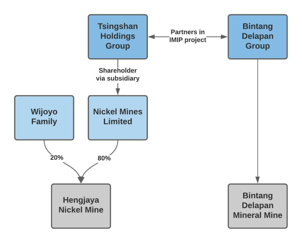 Project Developers: PT Indonesia Morowali Industrial Park is a joint venture between: Shanghai Decent Investment (Group) Company Limited (a subsidiary of Tsingshan Holding Group Company Limited), 49.7%; PT Bintang Delapan Group, 25.3%; and PT Sulawesi Mining Investment, 25%.Processing facilities within the park: Subsidiaries of Tsingshan Holding Group Company Limited; GEM Company Limited; Contemporary Amperex Technology Company Limited (CATL); Huayou Cobalt Company Limited; China Molybdenum Company Limited; PT Sulawesi Mining Investment.Mines: Nickel Mining Limited; PT Bintang Delapan Mineral.Main Contractors: n/a