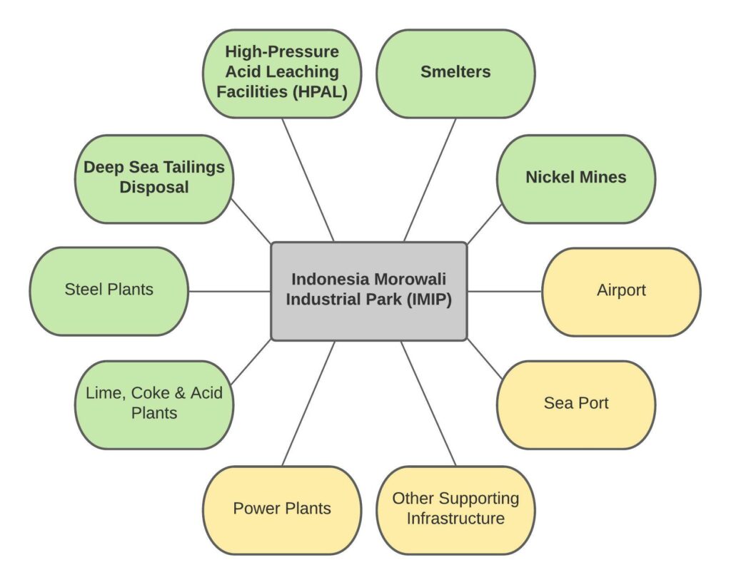 Project Status: The nickel mine and nickel smelters are operational; the HPAL facilities are under construction. A proposal for deep-sea tailings disposal at the HPAL facilities has been cancelled.Project OutlineThe Indonesia Morowali Industrial Park (IMIP) is in Fatufia Village, in the Bahadopi District of Morowali Regency, Central Sulawesi Province. This province is one of the nickel hotspots in a country with the richest nickel deposits in the world. However, despite massive growth in nickel-based industrialisation in the region since the mid-2010s, many people in Morowali are still engaged in traditional farming and fishing activities.The IMIP was initially a joint venture between Indonesia-based mining conglomerates PT Bintang Delapan Investment and PT Sulawesi Mining Investment (itself a joint venture between Bintang and the private Chinese company Tsingshan Holding Group), with strong backing from Shanghai Decent Investment Company Limited, which is also a subsidiary of Tsingshan Holding Group. In October 2013, Chinese President Xi Jinping and then Indonesian President Susilo Bambang Yudhoyono, oversaw the signing of a cooperation agreement to establish the industrial park.