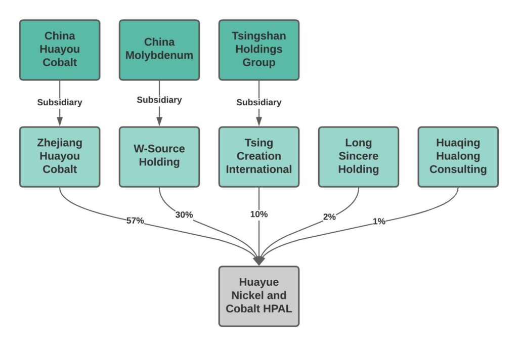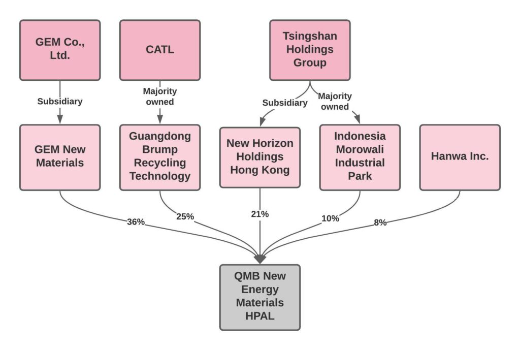 The QMB New Energy Materials HPAL plant is being developed by five joint-venture partners, four of which are private Chinese companies or wholly owned subsidiaries of Chinese companies. Notably, two of the Chinese joint-venture partners are subsidiaries of Tsingshan Holding, along with GEM and Guangdong Brunp Recycling Technology Company, which is majority owned by CATL.